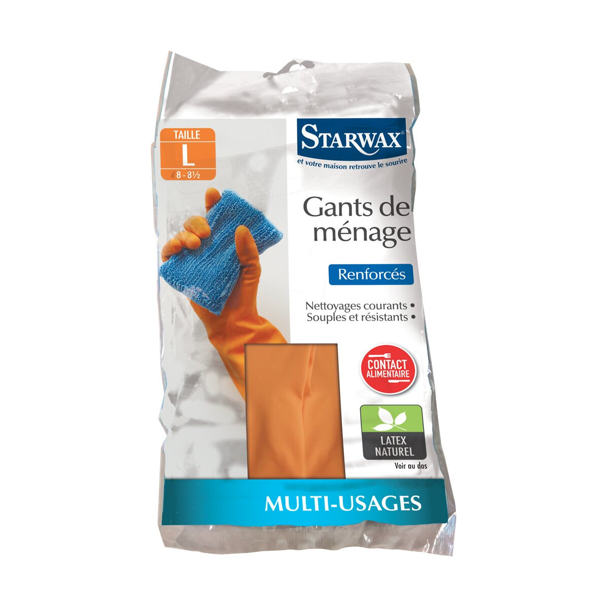 Recommandés pour les travaux ménagers courants (vaisselle, ménage…). Souples et résistants. Confort d’utilisation : ergonomiques (épousent bien la forme de la main et du poignet), bords ourlés (empêchent les liquides de couleur sur la peau), paume anti-glisse (le revêtement diamanté permet une meilleure prise en main des objets), intérieur floqué coton (optimise le confort et limite la transpiratio) et Faciles à mettre et à enlever. Peuvent s’utiliser avec le Gel vaisselle concentré ou les nettoyants mutli-usages Starwax.Spécifications techniques