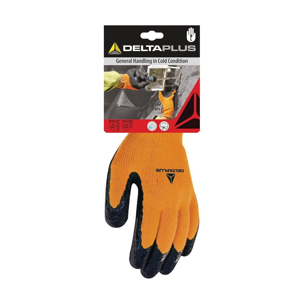 Gants hiver Ref. Apollon taille 9. Coloris orange et noir. 100% acrylique. Enduction mousse de latex sur paume et bouts des doigts. Très bonne résistance au froid
