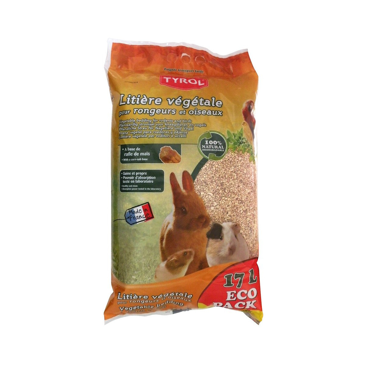 Litière végétale pour oiseaux et rongeurs Tyrol sac de 17L Mieux pour votre animal : Constituée de matières organiques naturelles, la litière végétale Tyrol est sans risque et non toxique pour votre animal. Elle n'engendre pas de problèmes respiratoires chez votre animal puisqu'elle ne contient presque pas de poussière. Mieux pour vous : La litière végétale Tyrol à base de rafle de maïs possède une structure en nid d'abeille qui aspire les liquides et limite les odeurs. Elle est facile à nettoyer puisque aucune boulette, glaise humide, ni agglomérat ne se forme. 100% naturelle, 100% biodégradable à base de rafle de maïSpécifications techniques