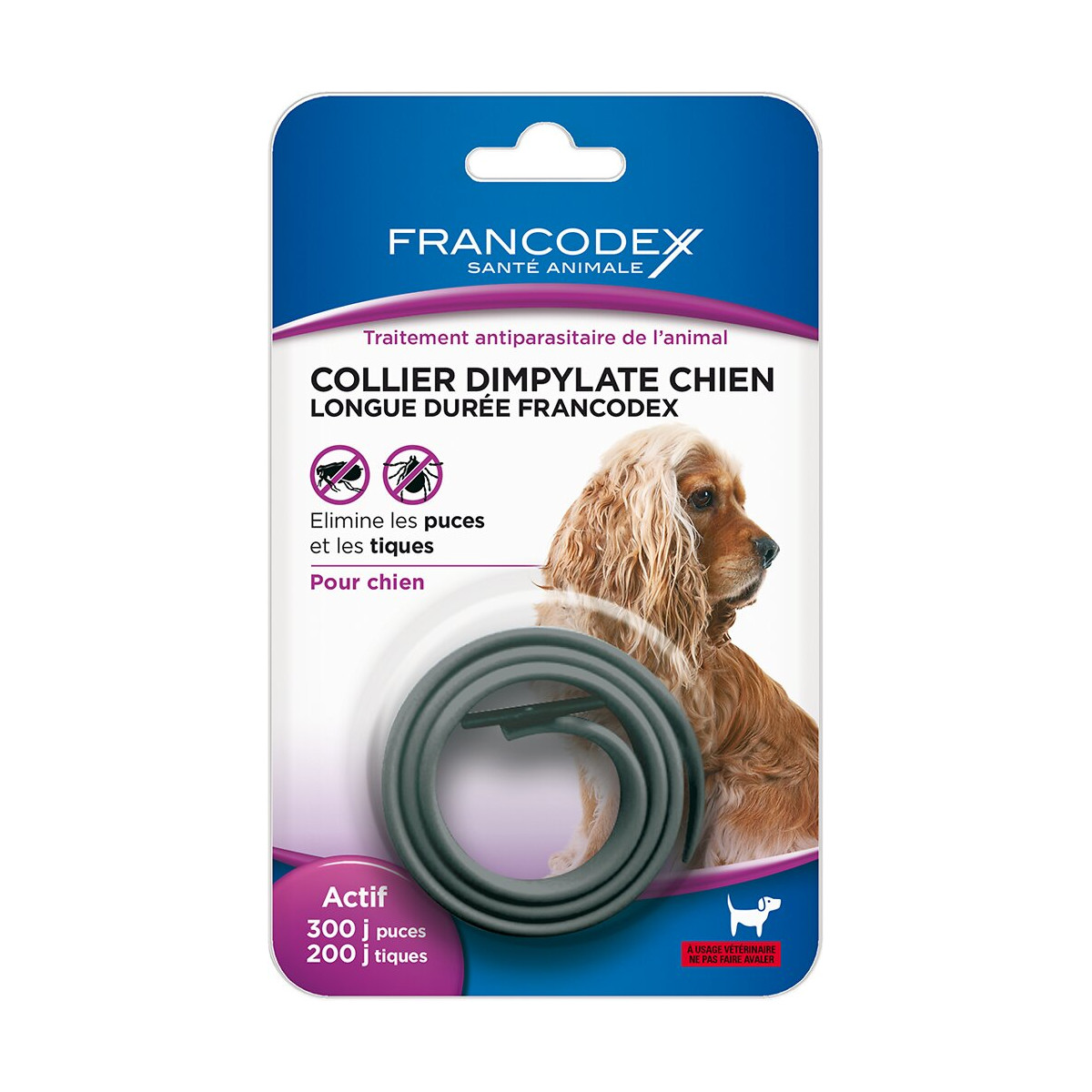Le collier antiparasitaire longue durée Francodex pour chien assure une protection de 300 jours contre les puces et de 200 jours contre les tiques. Grâce à sa trame plastique brevetée, le collier permet un relargage progressif et contrôlé du dimpylate même sous la pluie ou après un bain. En l'absence de données disponibles, ne pas utiliser chez les chiots de moins de 3 mois.