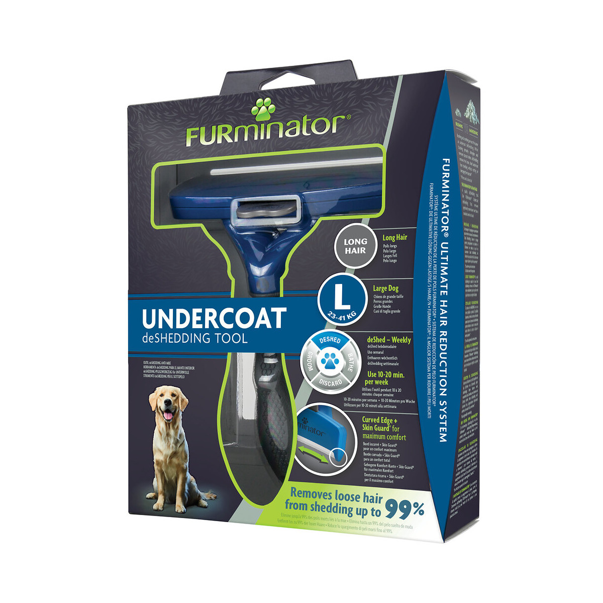 Le FURminator® Undercoat deShedding Tool pour très grands chiens (qui pèsent entre 23 et 41 ,kg) à poils longs élimine jusqu’à 99 ,% des poils morts. À utiliser une à deux fois par semaine, par séances de 10 à 20 minutes, sur un pelage sec. La lame deShedding en acier inoxydable atteint facilement le sous poil pour retirer en toute sécurité les poils morts sans endommager le poil de couverture ni risquer de couper la peau. Skin Guard® glisse sur la peau et évite que la lame ne la touche. Le bord incurvé épouse la silhouette de l’animal pour plus de confort. Le bouton pressoir FURejector® retire les poils morts accumulés lors du brossage pour un toilettage encore plus facile. L’étui de protection de la lame préserve les dents des dommages lorsque l’outil est rangé.Spécifications techniques