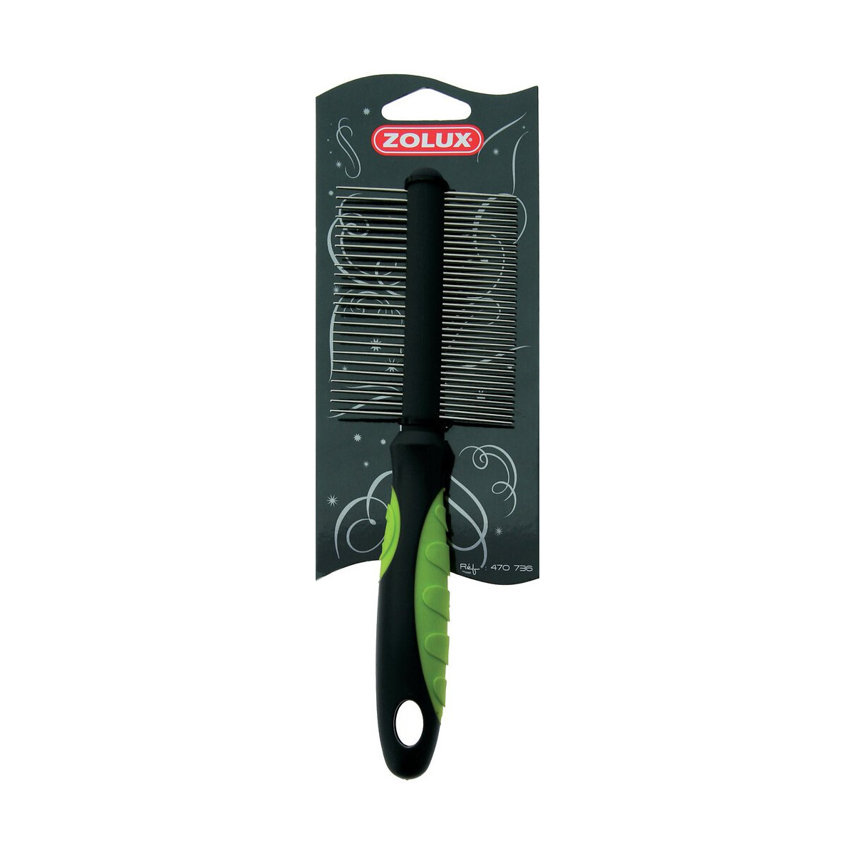 Le peigne double est efficace pour lisser non seulement les poils fins et soyeux (dents serrées) mais aussi les poils épais et bourrus (dents écartées). Il permet de retirer également les poils morts en période de mue. Composition : plastique PP et acier.