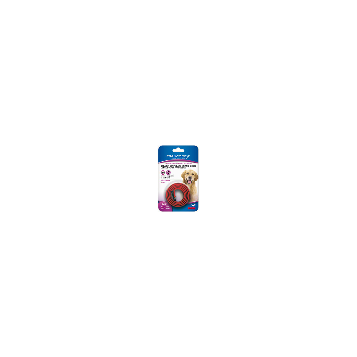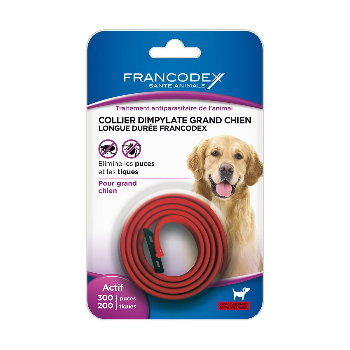 Le collier antiparasitaire longue durée chien Francodex assure une protection de 300 jours contre les puces et de 200 jours contre les tiques. Grâce à sa trame plastique brevetée, le collier permet un relargage progressif et contrôlé du dimpylate même sous la pluie ou après un bain. En l'absence de données disponibles, ne pas utiliser chez les chiots de moins de 3 mois.