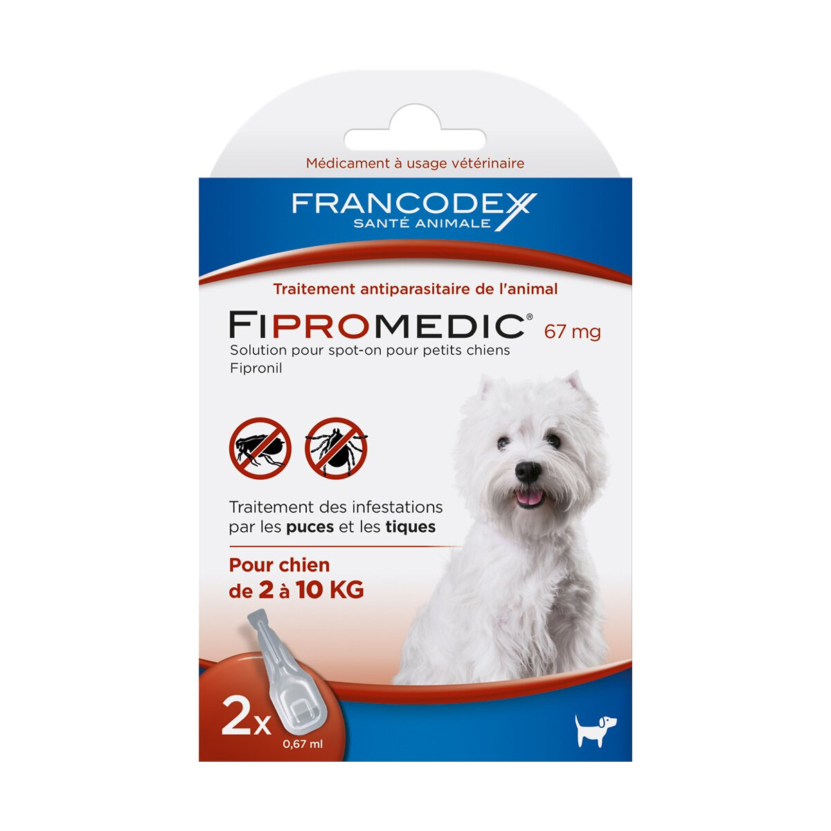 Fipromédic Solution pour spot-on pour petits chiens est un médicament antiparasitaire à base de fipronil (67 mg) qui permet d’éliminer les puces et les tiques. Efficacité contre les puces jusqu’à 8 semaines. Efficacité contre les tiques jusqu’à 4 semaines. Pour chien de plus de 2 mois et/ou de 2 kg. Posologie : 1 pipette de 0,67 ml pour un chien de 2 à 10 kg. Contenance : 2 pipettes x 0,6 7ml.