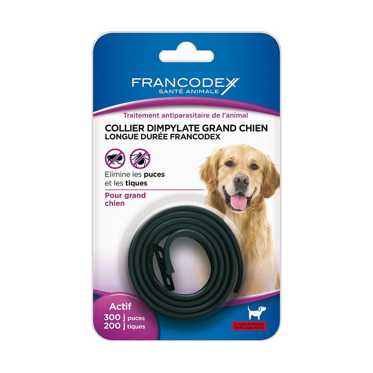 Le collier antiparasitaire longue durée Francodex pour chien assure une protection de 300 jours contre les puces et de 200 jours contre les tiques. Grâce à sa trame plastique brevetée, le collier permet un relargage progressif et contrôlé du dimpylate même sous la pluie ou après un bain. En l'absence de données disponibles, ne pas utiliser chez les chiots de moins de 3 mois.Spécifications techniques