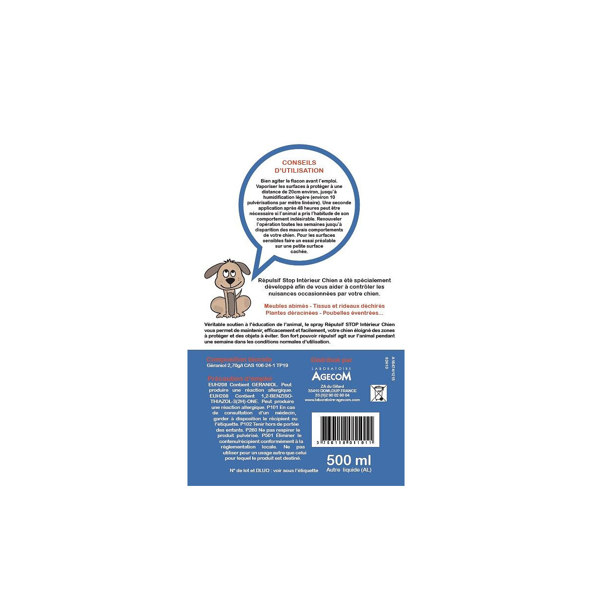 Répulsif Stop Chien a été spécialement développé afin de vous aider à contrôler les nuisances occasionnées par votre chien. Meubles abimés ? Tissus et rideaux déchirés ? Plantes déracinées ? Poubelles éventrées? Véritable soutien à l?éducation de l?animal, le spray Répulsif STOP Chien vous permet de maintenir, efficacement et facilement, votre chien éloigné des zones à protéger et des objets à éviter. Son fort pouvoir répulsif agit sur l?animal pendant une semaine dans les conditions normales d?utilisation.Spécifications techniques