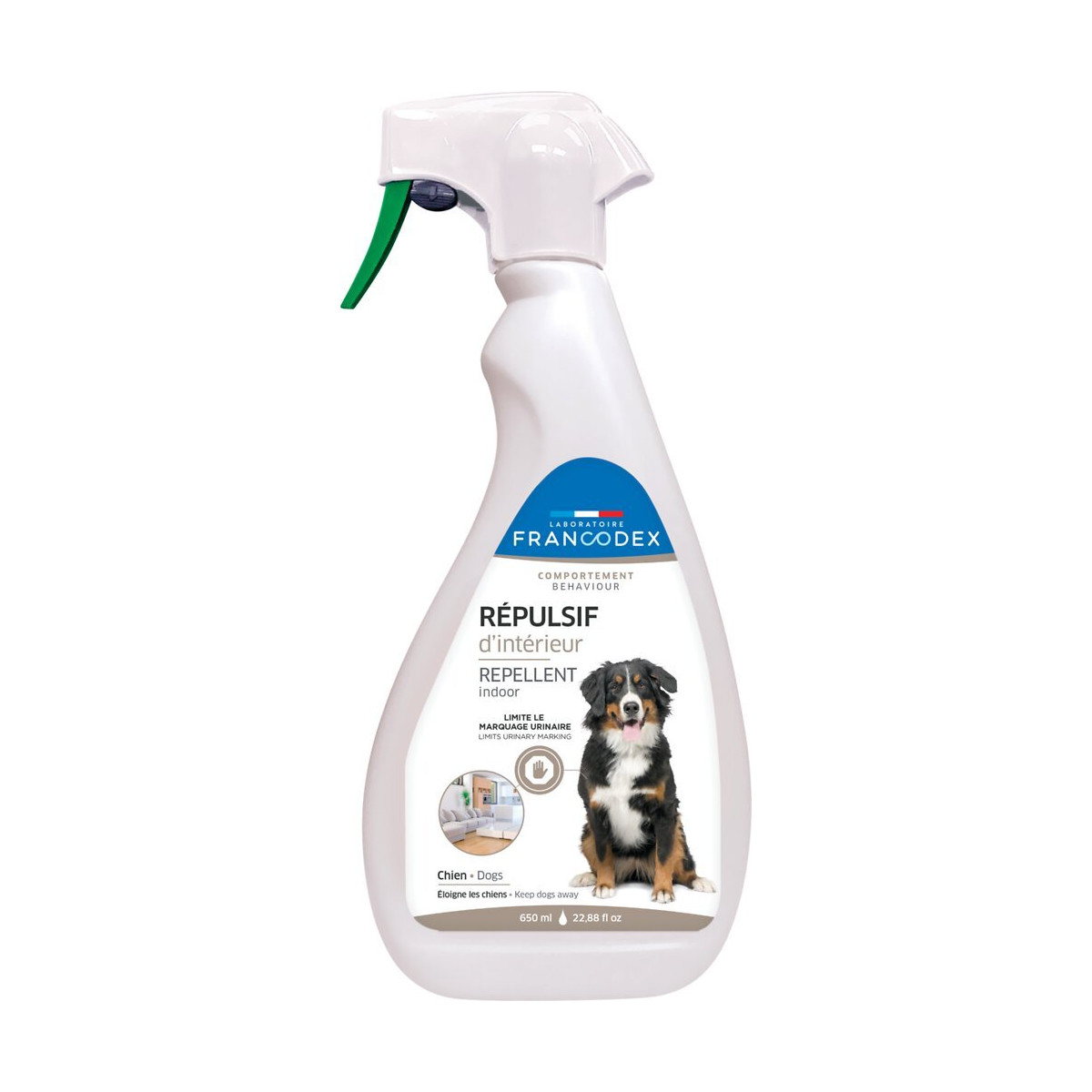 Le RÉPULSIF D’INTÉRIEUR POUR CHIEN FRANCODEX vous permet d’éloigner les chiens des lieux que vous souhaitez protéger. Il contribue ainsi à préserver votre environnement intérieur des dégradations causées par les chiens (portes, mobilier, canapé ). De plus, il laisse un agréable parfum frais.Spécifications techniques