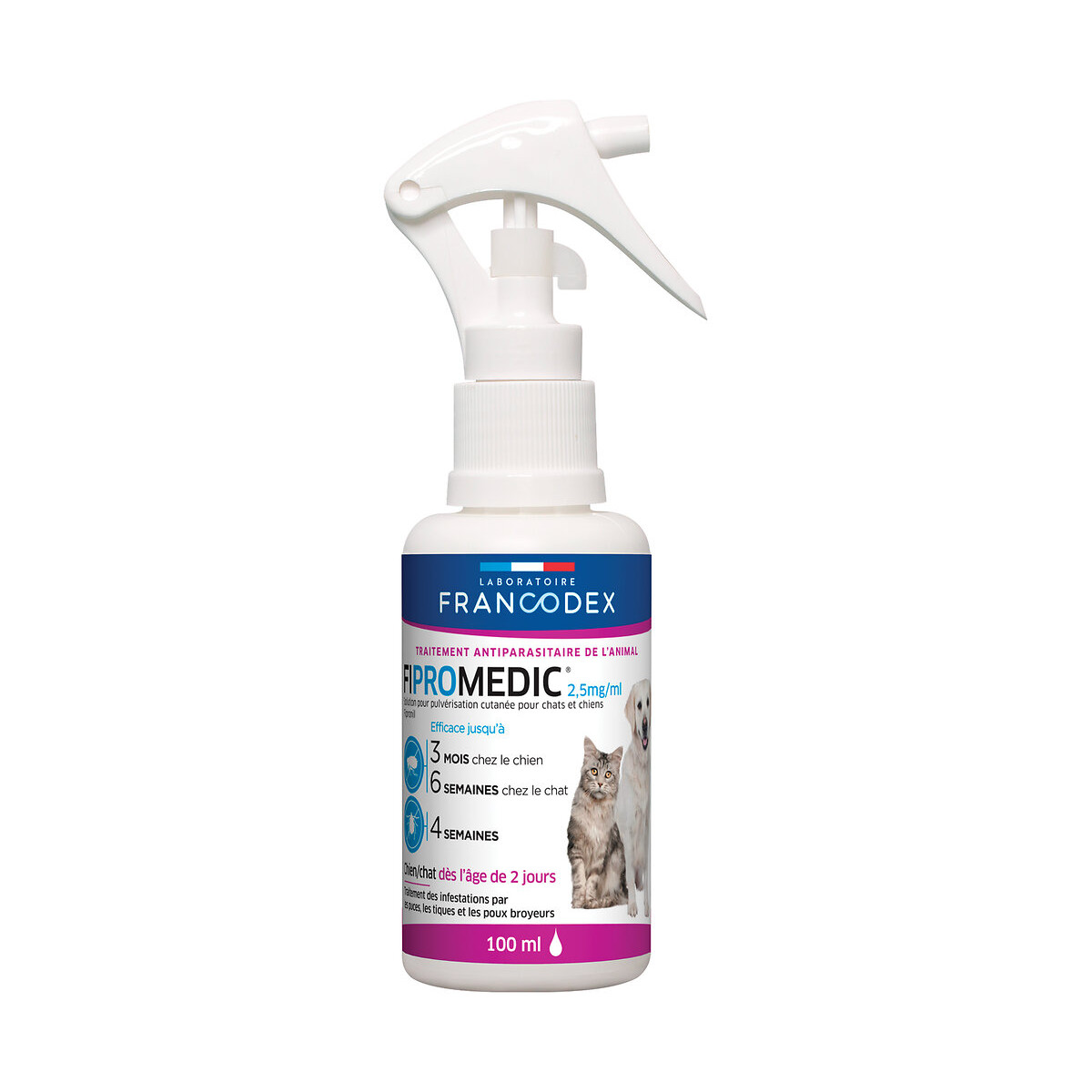 Fiproline 2,5 mg/ml Solution pour pulvérisation cutanée pour chats et chiens: pour un traitement des infestations par les puces, les tiques, et les poux broyeurs. Présentation économique : permet de traiter les chiens de différentes tailles, les chats, les chiennes allaitantes, les chiots et les chatons dès 2 jours. Posologie : afin d’humidifier le pelage jusqu’à la peau, appliquer 3 à 6 ml par kg de poids corporel, selon la longueur des poils. Contenance : 100 ml. Disponible aussi en 250 ml et 50 0ml.