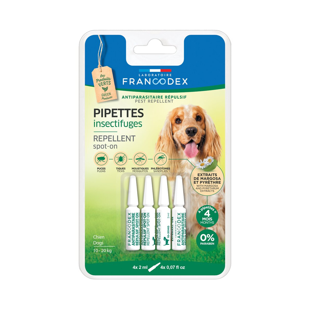Formulée à base d’extraits de margosa et pyrèthre aux propriétés répulsives, une PIPETTE INSECTIFUGE FRANCODEX protège votre animal de toute infestation par des parasites pendant 4 semaines. Grâce à la vitamine E, l’épiderme est hydraté et le follicule pileux renforcé. 1 pipette de 2 ml par application. Tenir la pipette droite vers le haut. Casser l’embout de la pipette et appliquer l’extrémité au contact de la peau. Vider le contenu entre les deux omoplates. Ne pas masser, le produit se diffusera le long du corps. Ne pas utiliser sur des chiots de moins de 2 mois. Ne pas utiliser durant la gestation ou la lactation. L’application peut être renouvelée au bout de 4 semaines.Spécifications techniques