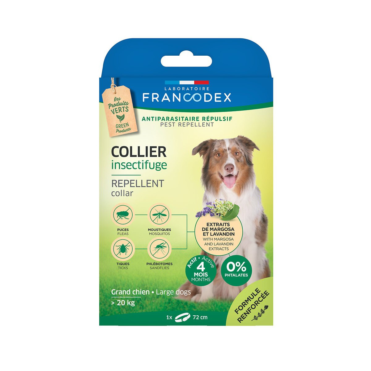 Sans PVC, sans phtalates et formulé à base d’extraits de margosa aux propriétés répulsives, le COLLIER INSECTIFUGE FRANCODEX protège votre chien pendant 4 mois de toute infestation par des parasites. Collier de 72cm.Spécifications techniques