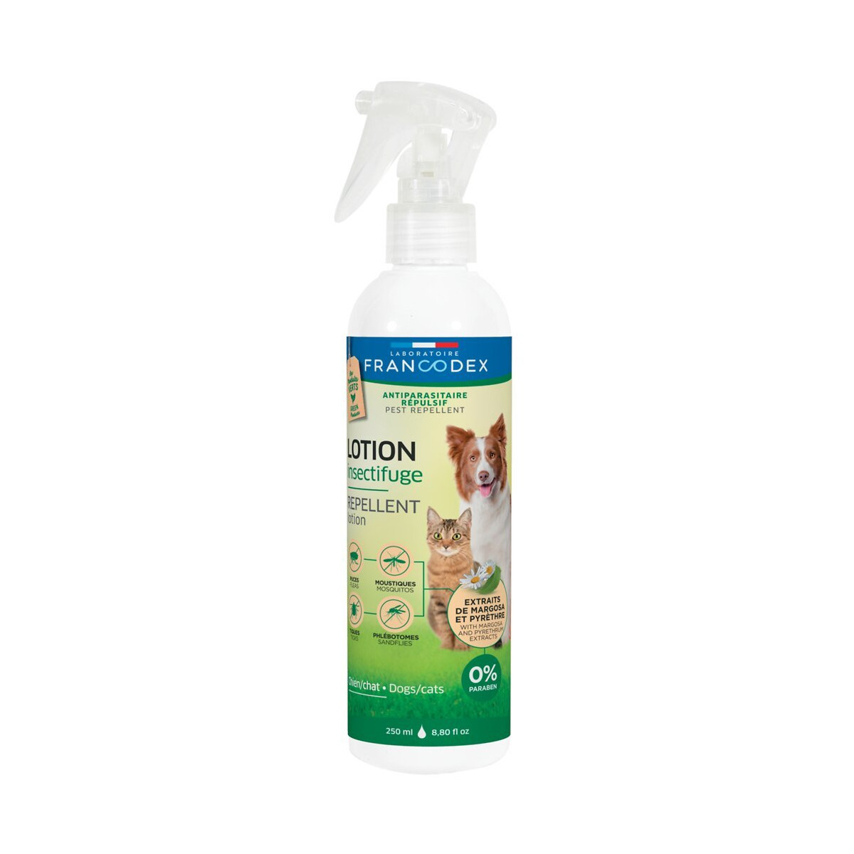 Formulée à base d’extraits de margosa et pyrèthre aux propriétés répulsives, la LOTION INSECTIFUGE FRANCODEX protège votre animal de toute infestation par des parasites. Idéale pour les animaux difficiles à baigner, la lotion nettoie le pelage en douceur tout en respectant l’épiderme et ne nécessite aucun rinçage. agiter le flacon avant utilisation. Vaporiser le produit sur tout le corps de façon uniforme. Eviter tout contact avec les yeux et les muqueuses. Pour une efficacité optimale, renouveler l’opération une fois par semaine. En cas de forte infestation, renouveler l’opération jusqu’à disparition des parasites. Ne pas utiliser sur des chiots et chatons de moins de 3 mois. Ne pas utiliser durant la gestation ou la lactationSpécifications techniques