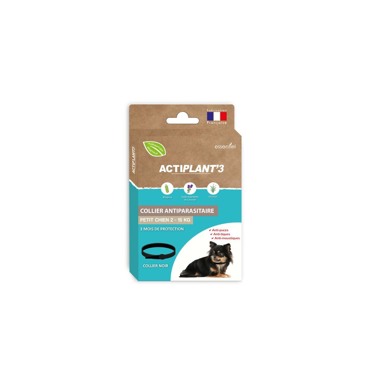 Le collier antiparasitaire Actiplant?3 a été spécialement formulé à partir de Géraniol, de Margosa et de Lavandin, des substances actives issues du monde végétal et reconnues pour leurs propriétés répulsives. La combinaison de ces 3 actifs associés dans une même formule crée un véritable booster végétal et permet une action renforcée sur les parasites. Après libération à la surface du collier, le mélange actif est réparti sur toute la surface de l?animal en quelques heures, par diffusion dans les lipides cutanés (sébum). Le collier ne craint pas l?eau et ne trouble pas l?odeur de l?animal. Collier équipé d?un système de sécurité « anti-étranglement ». Collier insectifuge antiparasitaire pour petit chien, de plus de deux mois et entre 2 et 15 kg. Permet efficacement de lutter contre les puces, les tiques et les moustiques.Spécifications techniques