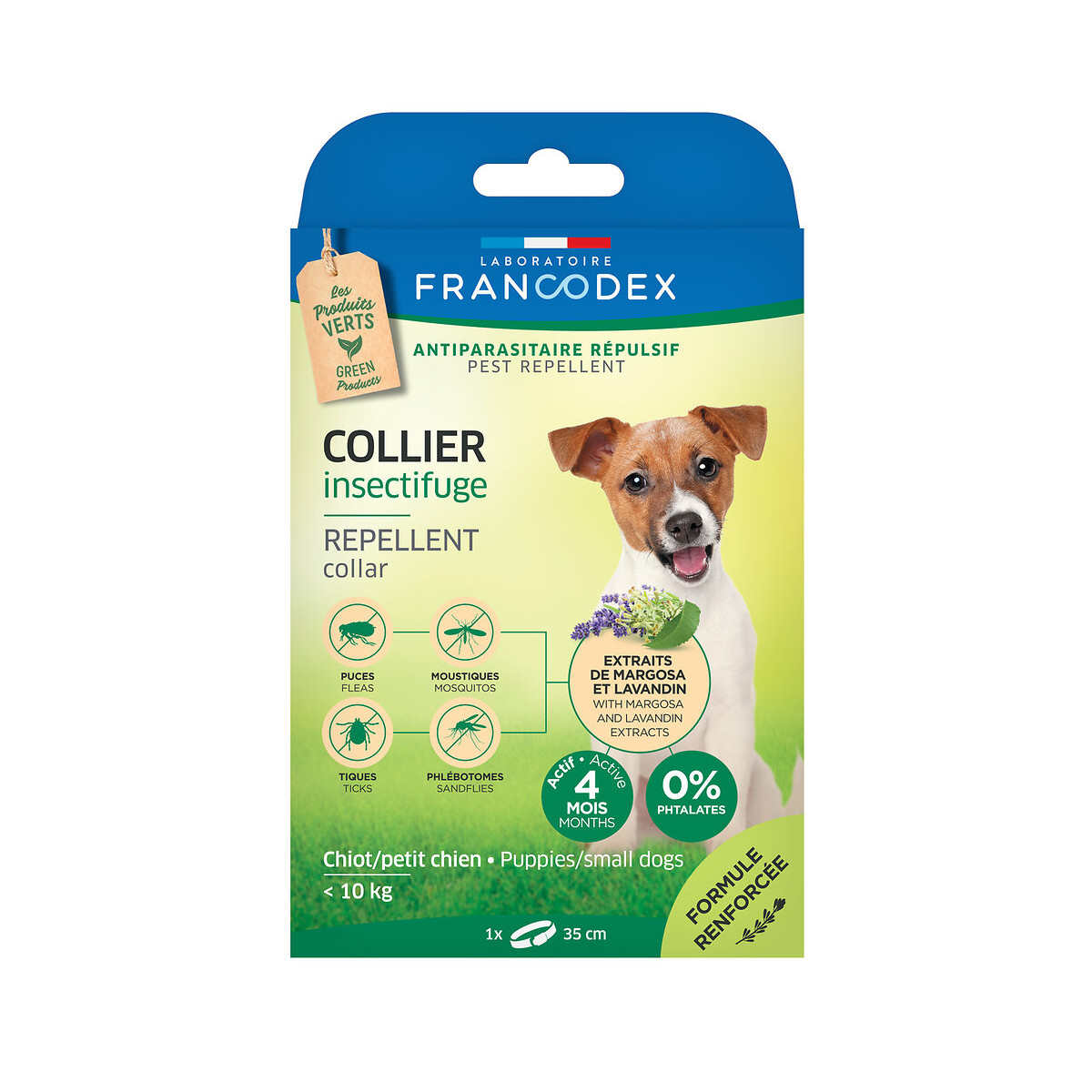 Sans PVC, sans phtalates et formulé à base d’extraits de margosa aux propriétés répulsives, le COLLIER INSECTIFUGE FRANCODEX protège votre chien pendant 4 mois de toute infestation par des parasites. Collier de 35cm. 1/ Dérouler le collier en tirant sur la languette comme indiqué sur le schéma. 2/ Fixer le collier autour du cou de l’animal en passant l’extrémité de la lanière dans la boucle. 3/ Ne pas serrer le collier. 4/ Couper si nécessaire la partie excédentaire. Agit immédiatement. Remplacer le collier au bout de 4 mois ou avant si vous constatez la présence de parasites. Résiste à l’eau.Spécifications techniques