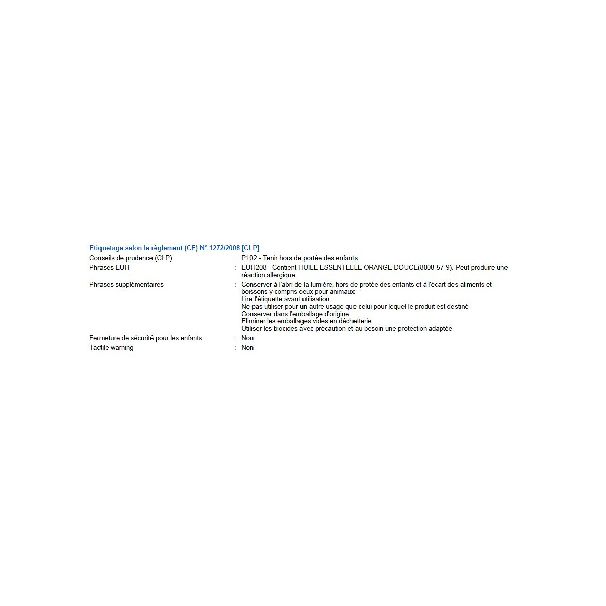Le RÉPULSIF D’EXTÉRIEUR POUR CHIEN FRANCODEX vous permet d’éloigner les chiens des lieux que vous souhaitez protéger. Il contribue ainsi à préserver votre environnement extérieur des dégradations causées par les chiens (trottoirs, façades, grilles, clôtures, roues de véhicules ). De plus, il laisse un agréable parfum d’agrumes et de lavande.Spécifications techniques