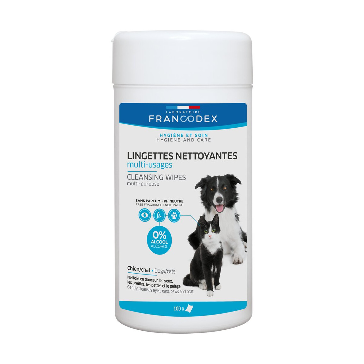 Les lingettes nettoyantes multi-usages chien / chat Francodex sont idéales pour nettoyer en douceur les yeux, les oreilles et les pattes de votre chien ou de votre chat, tout en respectant la peau de votre animal. Ces lingettes sont recommandées pour la toilette quotidienne de votre animal de compagnie. Contenance : 100 lingettes par boite.Spécifications techniques