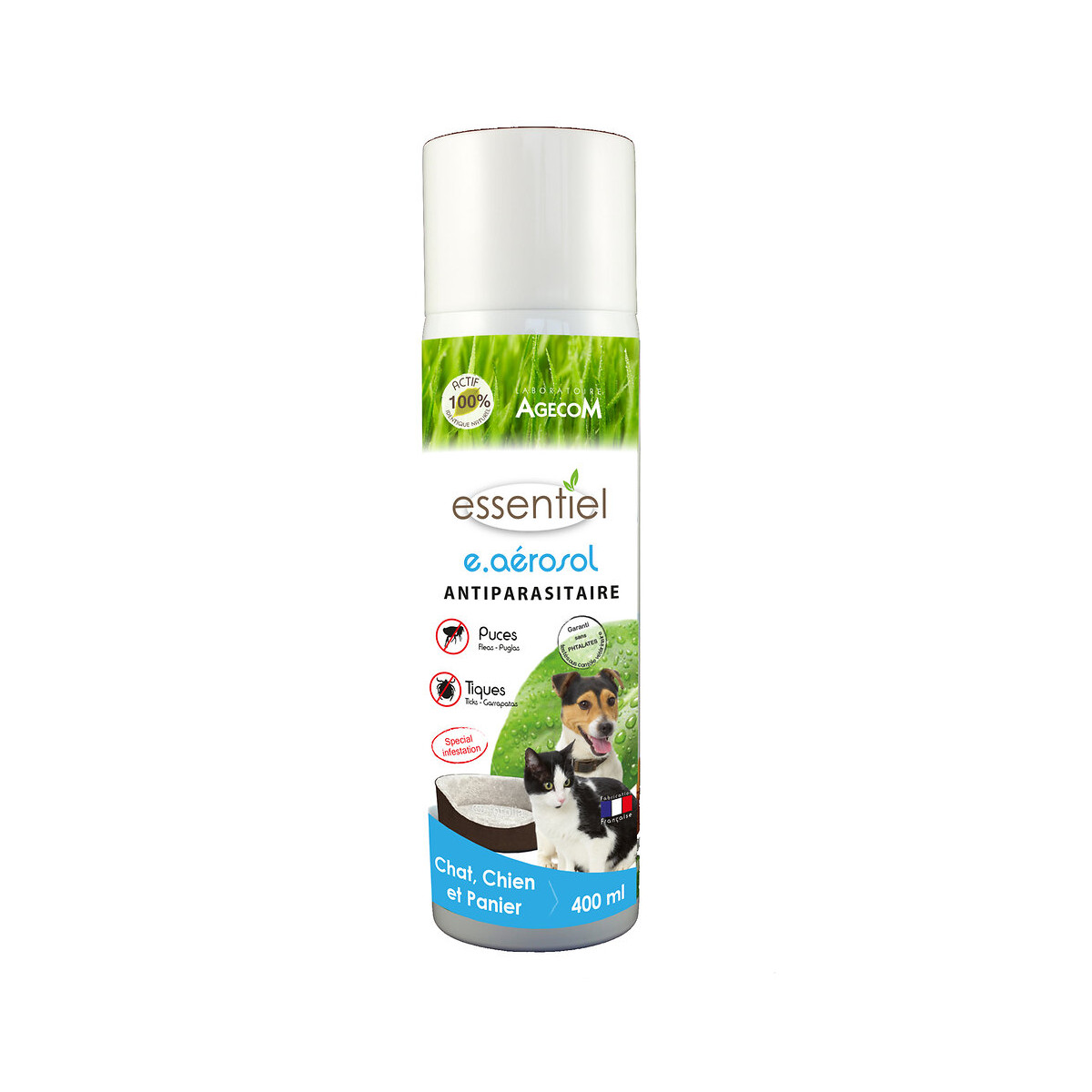 E.Aérosol est un antiparasitaire qui lutte contre les puces, tiques et autres parasites du chien, chat présents sur l’animal et sur ses lieux de couchage.Spécifications techniques