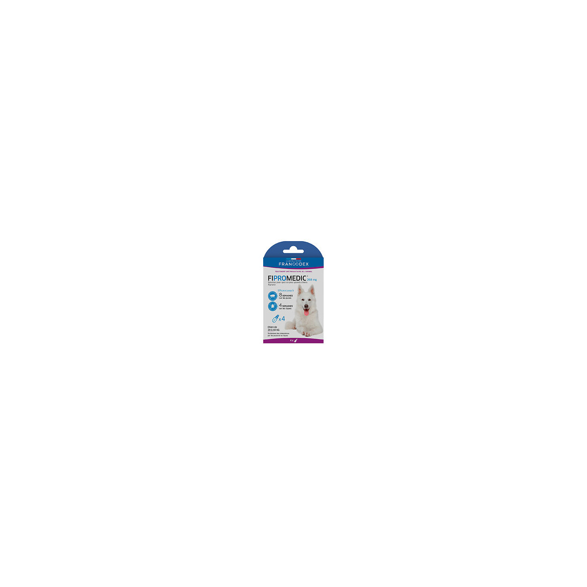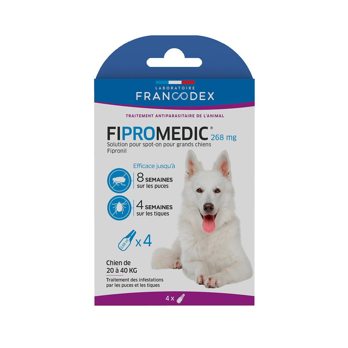 Fipromédic Solution pour spot-on pour grands chiens est un médicament antiparasitaire à base de fipronil (268 mg) qui permet d’éliminer les puces et les tiques. Efficacité contre les puces jusqu’à 8 semaines. Efficacité contre les tiques jusqu’à 4 semaines. Pour chien de plus de 2 mois et/ou de 2 kg. Posologie : 1 pipette de 2,68 ml pour un chien de 20 à 40 kg. Contenance : 4 pipettes x 2,68 ml.