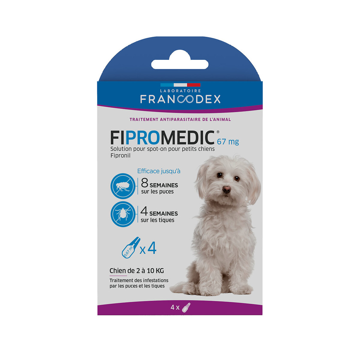 Fipromédic Solution pour spot-on pour petits chiens est un médicament antiparasitaire à base de fipronil (67 mg) qui permet d’éliminer les puces et les tiques. Efficacité contre les puces jusqu’à 8 semaines. Efficacité contre les tiques jusqu’à 4 semaines. Pour chien de plus de 2 mois et/ou de 2 kg. Posologie : 1 pipette de 0,67 ml pour un chien de 2 à 10 kg. Contenance : 4 pipettes x 0,67 ml.