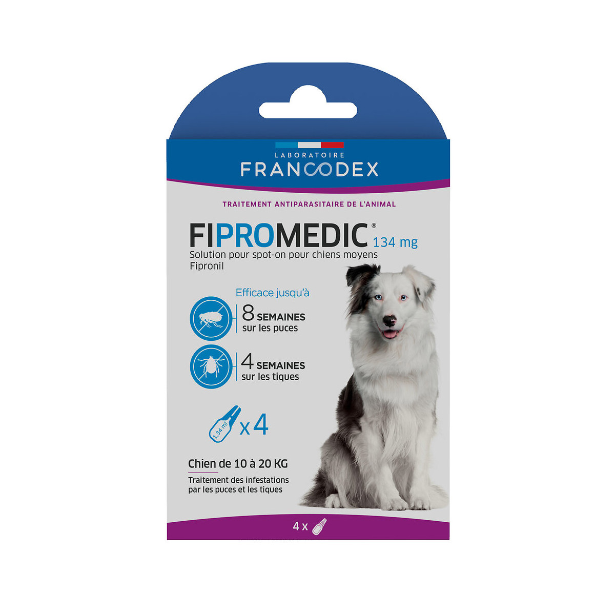 Fipromédic Solution pour spot-on pour chiens moyens est un médicament antiparasitaire à base de fipronil (134 mg) qui permet d’éliminer les puces et les tiques. Efficacité contre les puces jusqu’à 8 semaines. Efficacité contre les tiques jusqu’à 4 semaines. Pour chien de plus de 2 mois et/ou de 2 kg. Posologie : 1 pipette de 1,34 ml pour un chien de 10 à 20 kg. Contenance : 4 pipettes x 1,34 ml.