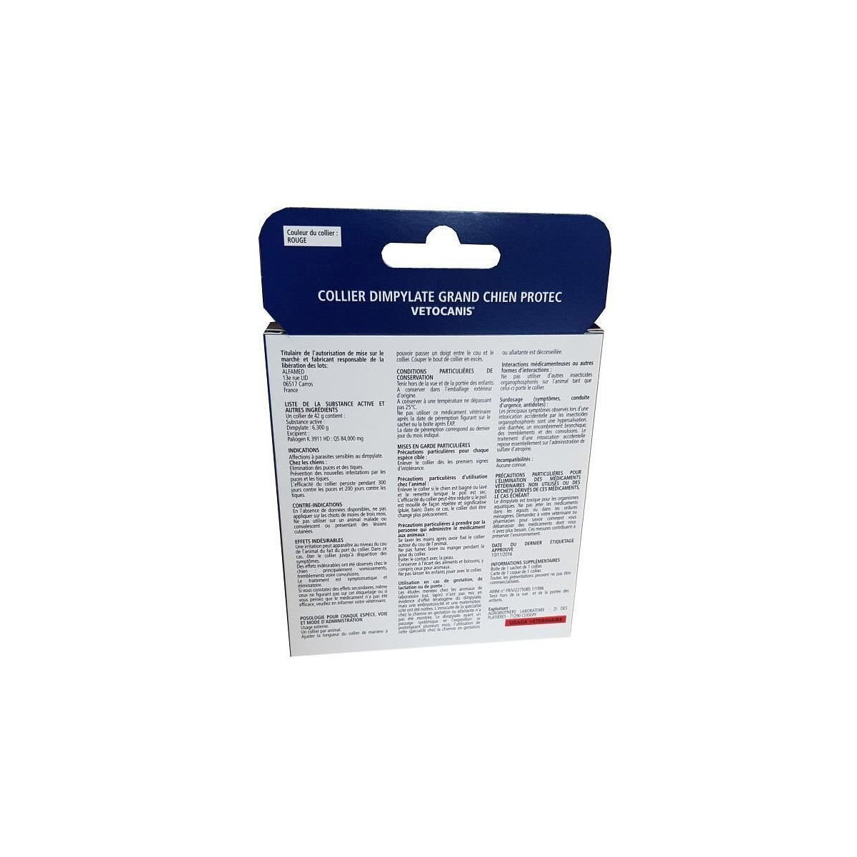 VETOCANIS Collier anti-puces et anti-tiques au dympylate - Prévient des nouvelles infestations - Durée de protection : 300 jours pour les puces et 200 jours pour les tiques - Usage vétérinaire - Rouge - Pour grand chienSpécifications techniques