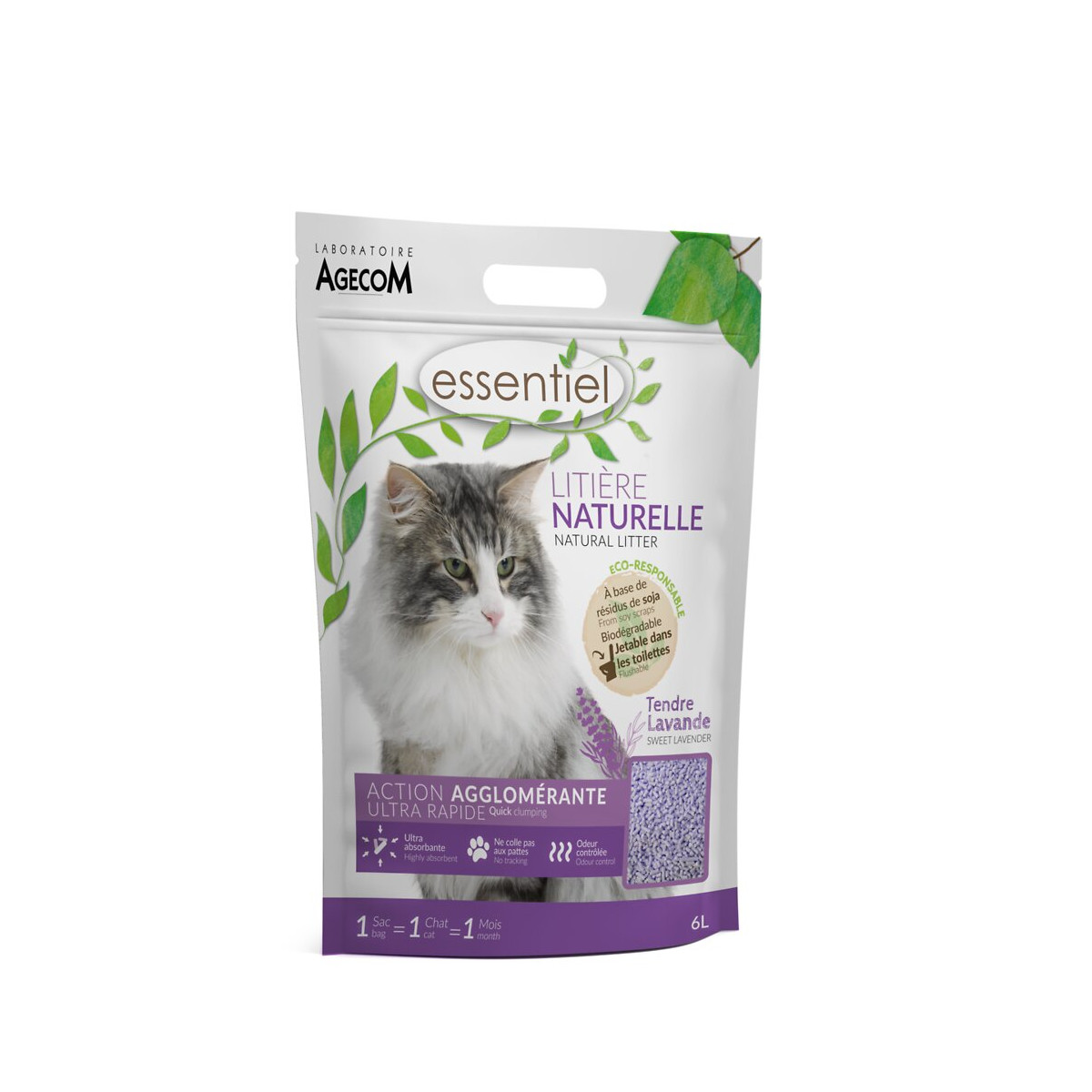 La Litière Naturelle Essentiel possède un excellent pouvoir d’agglomération : au contact des liquides, elle forme immédiatement de petits blocs compacts que vous pouvez retirer facilement chaque jour, gardant ainsi une litière entièrement propre. , Dépoussiérée et parfumée naturellement, la Litière Naturelle Essentiel ne colle pas aux pattes de votre chat et absorbe parfaitement les odeurs, pour votre confort et celui de votre compagnon. Une démarche ECO-RESPONSABLE La production de boisson au soja génère chaque année des centaines de milliers de tonnes de résidus de soja qui sont jetés dans les décharges. Les équipes Laboratoire Agecom ont eu l’idée d’exploiter ces déchets pour en faire une litière qui allie efficacité et préservation de l’environnement. Notre litière 100% biodégradable est jetable dans les toilettes sans risque pour la nature ou pour vos canalisations.Spécifications techniques