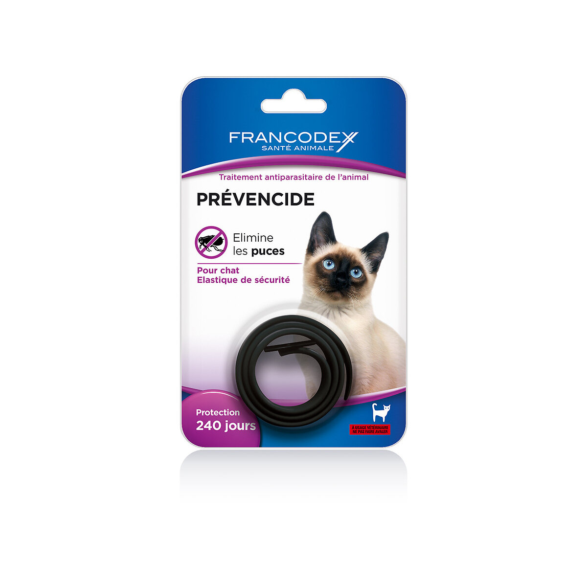 Ce collier antiparasitaire chat prévient des infestations parasitaires durant 240 jours contre les puces et possède une trame plastique brevetée qui permet un relargage contrôlé et homogène de l’insecticide. En outre, ce collier comporte un élastique de sécurité anti-étranglement. Convient aux chats adultes et chatons de plus de 3 mois.