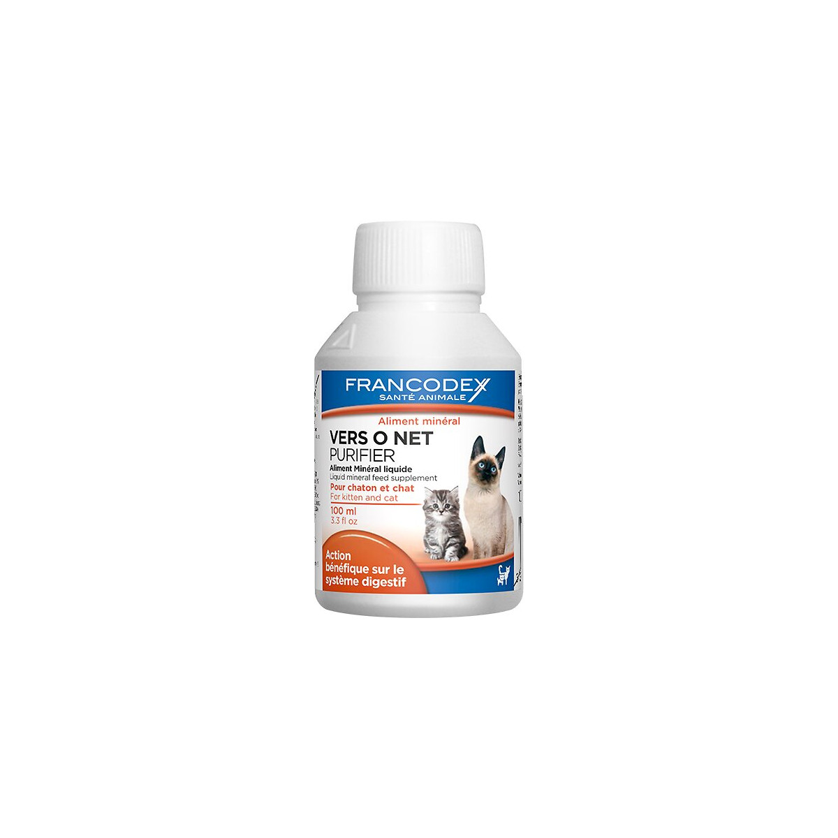 Vers O Net est un aliment minéral liquide pour chaton et chat qui apporte une action bénéfique sur le système digestif et participe au confort intestinal de votre compagnon. Contenance : 100 ml.