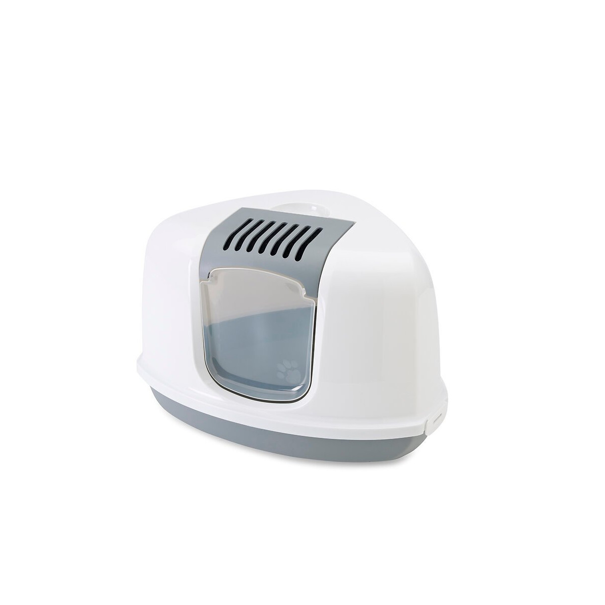 Maison de toilette pour chats. Spécialement développée afin d'être placée dans les coins, permet de gagner de la place. Facile à nettoyer grâce à la façade rabattable. Avec filtre. Poignée intégrée.