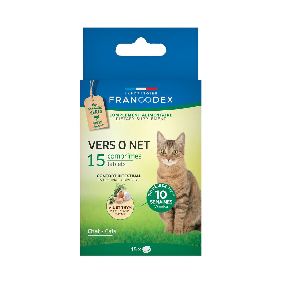 Les chats peuvent être soumis à des stress, des changements alimentaires ou des agents agresseurs (œufs ou larves de parasites) entrainant des problèmes intestinaux. Les comprimés VERS O NET FRANCODEX contiennent des substances aromatiques de plantes (ail et thym), ainsi que des oligo-éléments, pour participer au confort intestinal de votre chat et renforcer ses défenses naturelles.Spécifications techniques