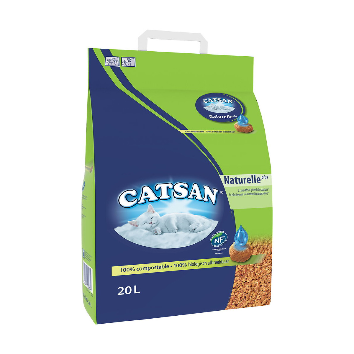 Litière pour chats végétale 100% compostable. La litière Catsan™ Naturelle Plus est composée de petits grains de bois tendre qui absorbent instantanément les liquides comme une éponge. Grâce aux essences de bois et au pH peu élevé, les petits grains de bois empêchent très efficacement le développement des odeurs. La litière pour chat Catsan™ Naturelle Pluss est disponible en format sac de 20L.Spécifications techniques