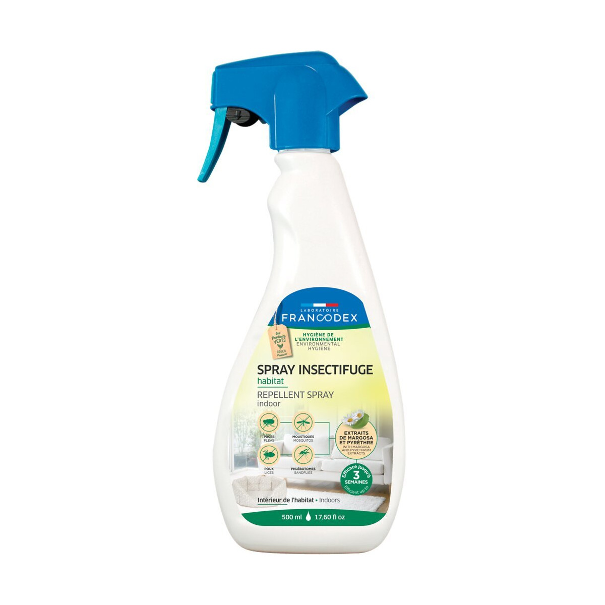 Formulé à base d'extraits de margosa et de pyrèthre, aux propriétés répulsives, le spray insectifuge pour l'environnement Francodex permet de protéger votre intérieur des infestations par les puces et autres insectes se nourrissant de sang. Parfum floral Vaporiser le produit sur les endroits susceptibles d’être infestés par les parasites et où votre animal aime se coucher (panière, niches ) en évitant les canapés et tissus d’ameublements. Le Spray Insectifuge Habitat vous protègera pendant 3 semaines. En cas de forte infestation, renouveler l’opération une fois par semaine jusqu’à disparition des parasites.Spécifications techniques