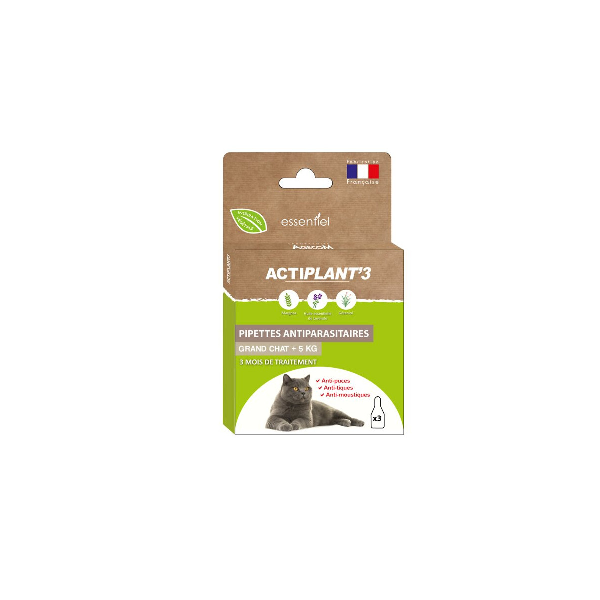Les pipettes antiparasitaires Actiplant?3 ont été spécialement formulées à partir de susbtances actives issues du monde végétal et reconnues pour leurs propriétés répulsives. Chaque molécule a une action spécifique sur les parasites externes. La combinaison de ces 3 actifs associés dans une même formule crée un véritable booster végétal et permet une action renforcée sur les parasites. Après apposition sur la nuque de l?animal, le mélange actif est réparti sur toute la surface de l?animal en quelques heures, par diffusion dans les lipides cutanés (sébum). La substance ne trouble pas l?odeur de l?animal. Pipettes insectifuges antiparasitaires pour grand chat de plus de 5 kilos (3 x 1 ml). Permet efficacement de lutter contre les puces, les tiques et les moustiques. 1 pipette = 1 mois de protection.