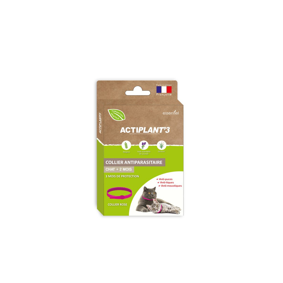 Le collier antiparasitaire Actiplant?3 a été spécialement formulé à partir de Géraniol, de Margosa et de Lavandin, des substances actives issues du monde végétal et reconnues pour leurs propriétés répulsives. La combinaison de ces 3 actifs associés dans une même formule crée un véritable booster végétal et permet une action renforcée sur les parasites. Après libération à la surface du collier, le mélange actif est réparti sur toute la surface de l?animal en quelques heures, par diffusion dans les lipides cutanés (sébum). Le collier ne craint pas l?eau et ne trouble pas l?odeur de l?animal. Collier équipé d?un système de sécurité « anti-étranglement ». Collier insectifuge antiparasitaire pour chat de plus de 2 mois. Permet efficacement de lutter contre les puces, les tiques et les moustiques.