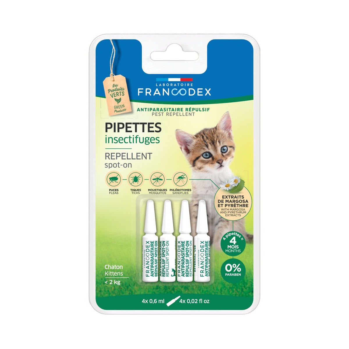 Formulée à base d’extraits de margosa et pyrèthre aux propriétés répulsives, une PIPETTE INSECTIFUGE FRANCODEX protège votre animal de toute infestation par des parasites pendant 4 semaines. Grâce à la vitamine E, l’épiderme est hydraté et le follicule pileux renforcé. 1 pipette de 0,6 ml par application. Tenir la pipette droite vers le haut. Casser l’embout de la pipette et appliquer l’extrémité au contact de la peau. Vider le contenu entre les deux omoplates. Ne pas masser, le produit se diffusera le long du corps. Ne pas utiliser sur des chatons de moins de 2 mois. Ne pas utiliser durant la gestation ou la lactation. L’application peut être renouvelée au bout de 4 semaines.Spécifications techniques