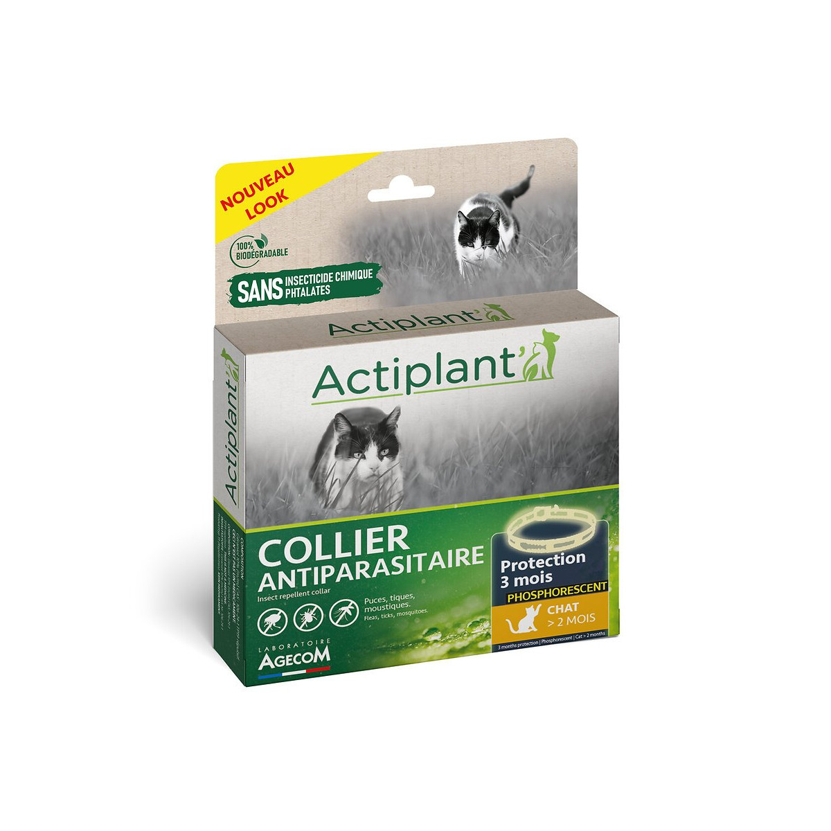 Lutte contre les ectoparasites du chat : puces et tiques. Le principe actif d?origine naturelle a un fort pouvoir antiparasitaire sur la plupart des ectoparasites du chat. Cette substance agit en saturant les chémorécepteurs des insectes et des acariens empêchant ces derniers d?avoir un comportement alimentaire normal. Le principe actif, naturellement lipophile, est formulé dans une matrice polymérique à relargage contrôlé. Cette forme galénique permet une cinétique de libération du principe actif quasi linéaire pendant au moins 3 mois. Après libération à la surface du collier, le produit est réparti sur toute la surface de l?animal en quelques heures, par diffusion dans les lipides cutanés (sébum). Les essences les plus volatiles agissent également par formation d?un halo autour du collier.