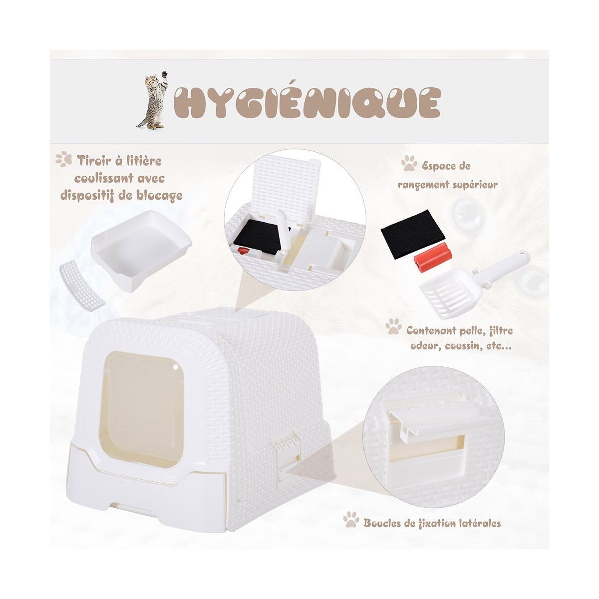 Cette maison de toilette pour chat est un accessoire pratique dans lequel votre boule de poils va faire ses besoins. Ce modèle est équipé d'un tiroir à litière, d'une porte battante, d'un filtre odeur et d'une pelle qui facilitent le nettoyage de la litière. Grâce à sa poignée intégrée, ce modèle est très facilement transportable. Caractéristiques : - Maison de toilette pour chat fabriqué en plastique PP résistant et durable - Revêtement résine tressée imitation rotin très élégant - Porte battante pour faciliter l'entrée et la sortie de votre chat - Tiroir à litière coulissant avec dispositif de blocage (pédale blanche intégrée) - Espace de rangement supérieur contenant pelle, filtre odeur, coussin, etc... - Equipée d'une poignée de transport - Boucles de fixation latérales pour le maintien du tiroir à litière Spécifications : - Couleur : blanc - Matériau principal : plastique PP - Dim. totales : L 54 x l 42 x H 41 cm - Dim. porte : l 21 x H 23 cm - Dim. tiroir de litière : L 52 x l 42 x H 13 cm - Accessoires fournis : 1 pelle à litière, 1 sac poubelle, 1 filtre odeur, 1 coussin - Livraison effectuée en un colis - Réf. : D31-002WTSpécifications techniques