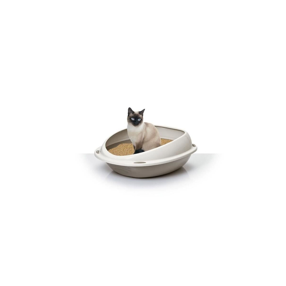 Bac a litiere ovale taupe et beige - Il possede une hauteur d'entrée basse pour faciliter l'acces de votre chat - Le Bac a litiere pour chat Shuttle de Aime est équipé d'un rebord de protection amovible, qui assure une propreté optimale de la piece, en évitant les projections d'urines ou de litiere - 57 x 40 x 19 cm.Spécifications techniques