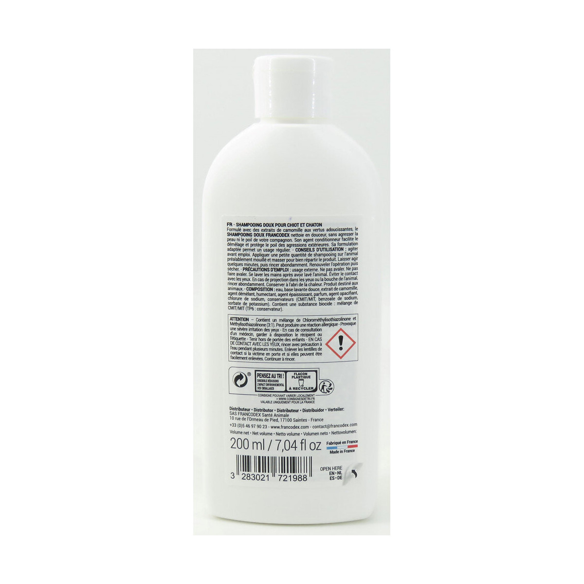 Shampooing Doux Pour Chiots et Chatons. flacon de 200 ml. LES + PRODUITS Extraits de camomille Respecte la peau fragile du chiot et du chaton Facilite le démêlage. description: Formulé avec des extraits de camomille aux vertus adoucissantes, le SHAMPOOING DOUX FRANCODEX nettoie en douceur, sans agresser la peau ni le poil de votre compagnon. Son agent conditionneur facilite le démêlage et protège le poil des agressions extérieures. Sa formulation adaptée permet un usage régulier. Shampooing Doux Pour Chiots et Chatons. flacon de 200 ml. LES + PRODUITS Extraits de camomille Respecte la peau fragile du chiot et du chaton Facilite le démêlage. description: Formulé avec des extraits de camomille aux vertus adoucissantes, le SHAMPOOING DOUX FRANCODEX nettoie en douceur, sans agresser la peau ni le poil de votre compagnon. Son agent conditionneur facilite le démêlage et protège le poil des agressions extérieures. Sa formulation adaptée permet un usage régulier. composition: eau, base lavante douce, extrait de camomille, agent démêlant, humectant, agent épaississant, parfum, agent opacifiant, chlorure de sodium, conservateurs (CMIT/MIT, benzoate de sodium, sorbate de potassium). mode d'emploi: Agiter avant emploi. Appliquer une petite quantité de shampooing sur l'animal préalablement mouillé et masser pour bien répartir le produit. Laisser agir quelques minutes puis rincer abondamment. Renouveler l'opération puis sécher. Photo non contractuelle, car il y a plusieurs vendeurs sur une même fiche produit.Spécifications techniques
