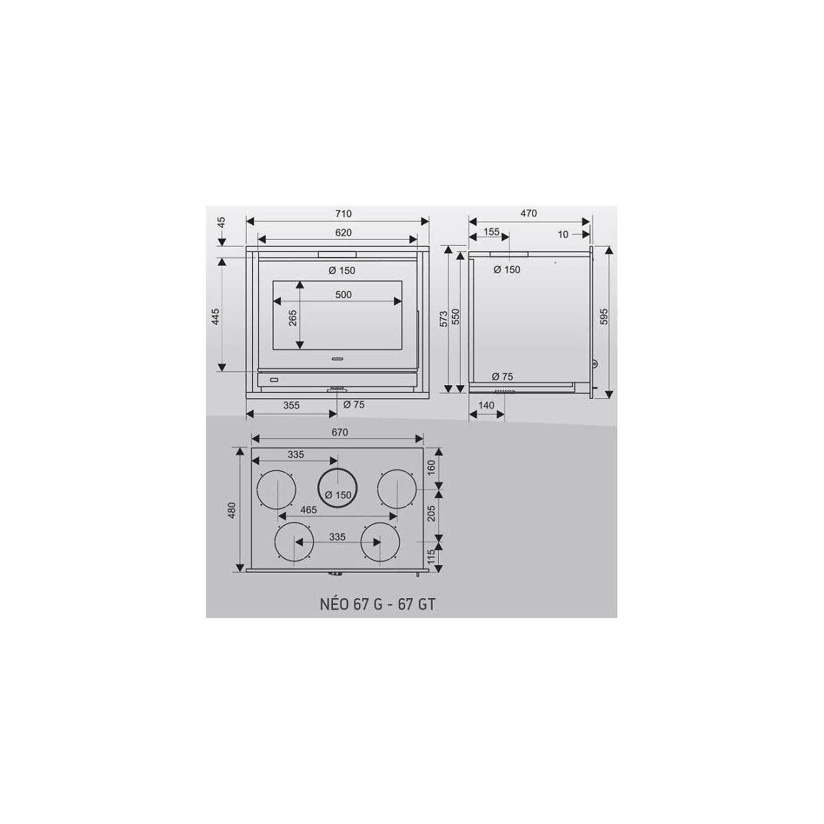 Foyer-insert Néo 67 - Conception ingénieuse : adaptée à l'implantation en cheminée ouverte comme à la création de cheminée - Carénage complet : dessus prépercé pour 4 buses de distribution d'air chaud (installation neuve seulement) - Intérieur fonte - Système Vitre Propre - Cendrier accessible en fonctionnement - Déflecteurs démontables - Porte plein verre sérigraphiée - Cadre de finition de série - Adapté aux habitations conformes à la RT 2012 : appareil étanche compatible avec les VMC double flux, idéal pour les maisons HQE, RT2012. Sa puissance nominale et son haut rendement combinés à sa faible émission de CO2 permettent de marier efficacité énergétique et protection de l'environnement - Prise d'air raccordable sur l'extérieur Ø 75 mm - Régulation manuelle - Raccordement Ø 150 mm. Le prix indiqué comprend la TVA à 20%.