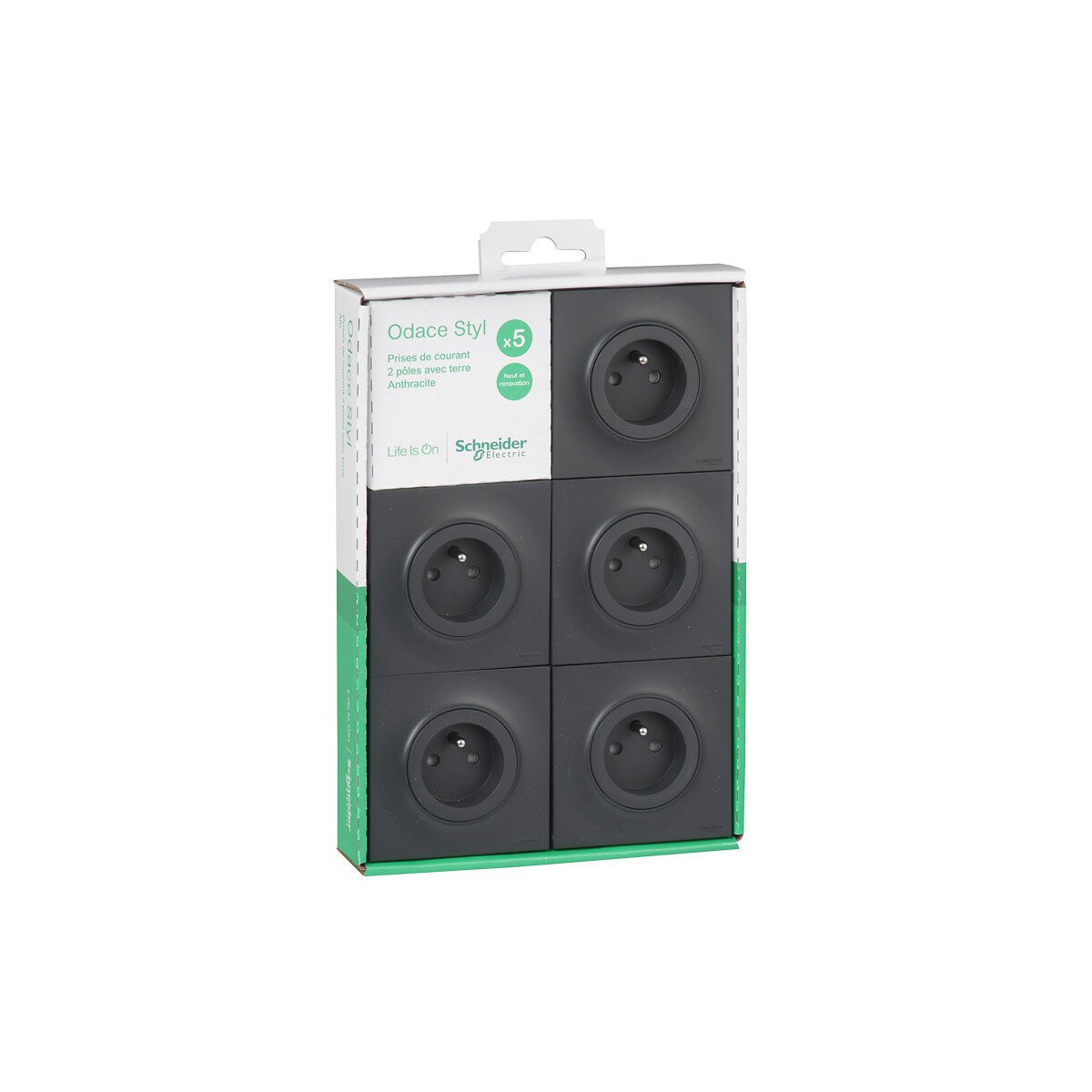 Lot De 5 Prises 2p+t (avec Plaque) Odace - Anthracite