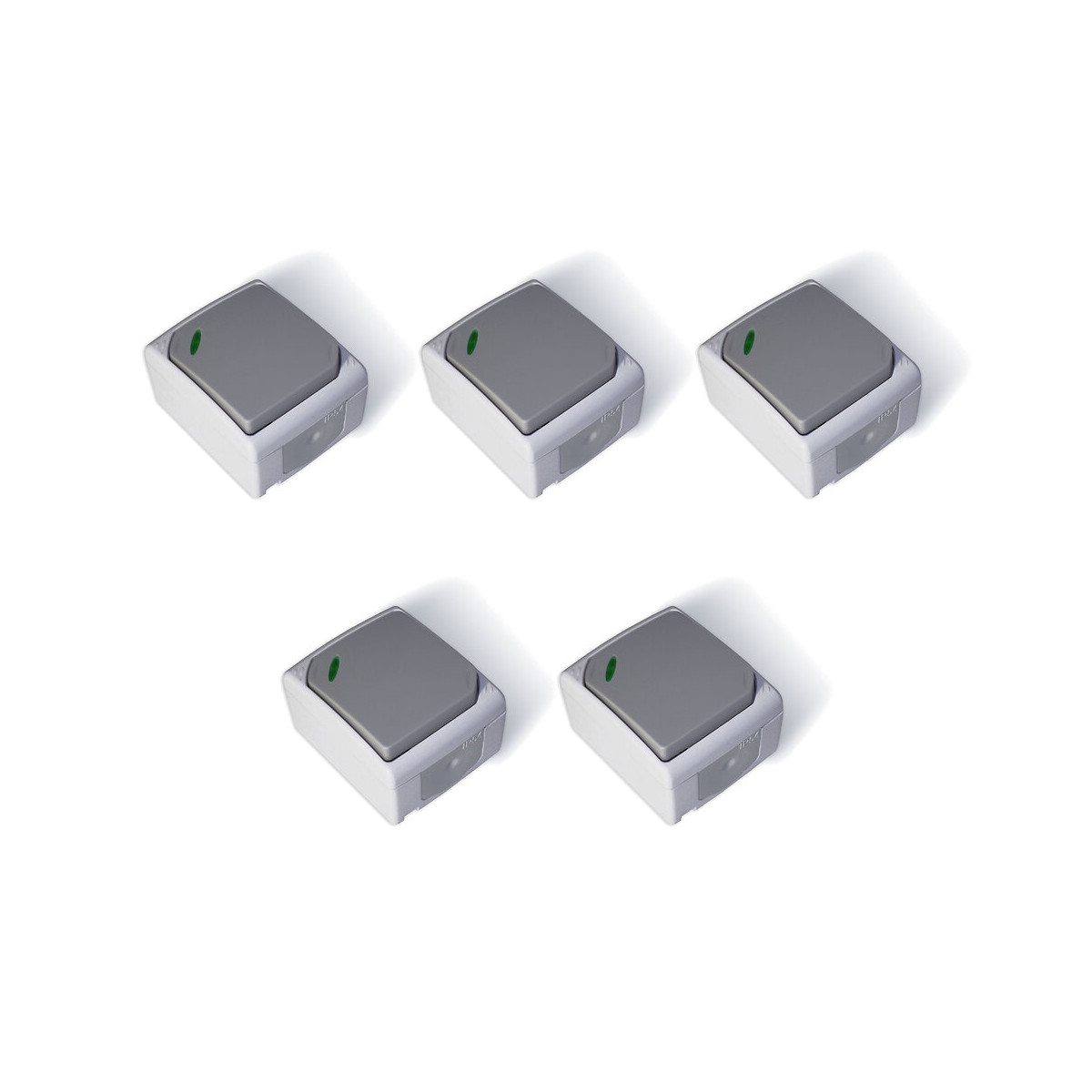 5 Interrupteurs va-et-vient avec voyant étanches gris 10A. Convient parfaitement à un usage extérieur (IP54). Possède un voyant lumineux pour vous aider à repérer le bouton dans l'obscurité. Puissance max: 2300W - 230V. Gamme de produits contemporaine et compacte. Câblage par bornes automatiques et raccordement rapide. S'intègre de façon harmonieuse à vos façades. Certifié CE et NF.