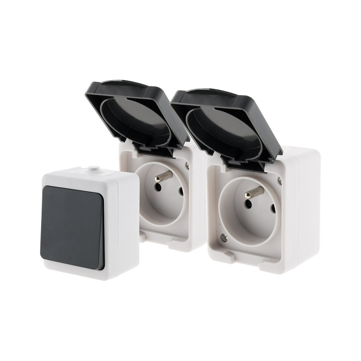 Lot de 3 interrupteurs va-et-vient étanches (IP54) 10A. Conviennent parfaitement à une utilisation en extérieur. Bornes à vis. Puissance: 2300W. 250V. S'intègre de façon harmonieuse à vos façades. Certifié CE et NF.