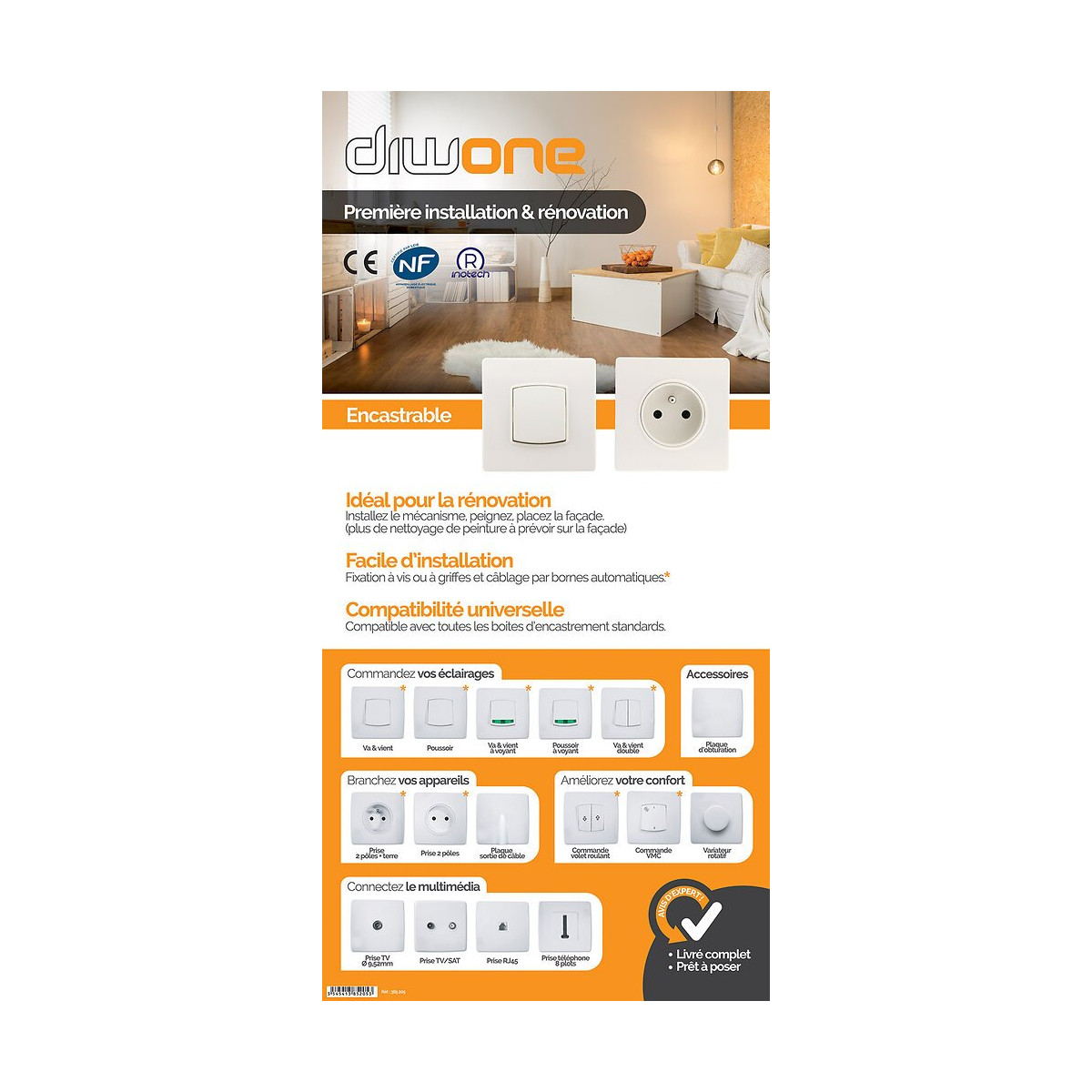 Interrupteur va-et-vient 10A à bornes automatiques. Puissance max 2300W sous 230V. Facile à installer et livré avec vis et griffes. Couleur: blanc. Certifié NF et CE.