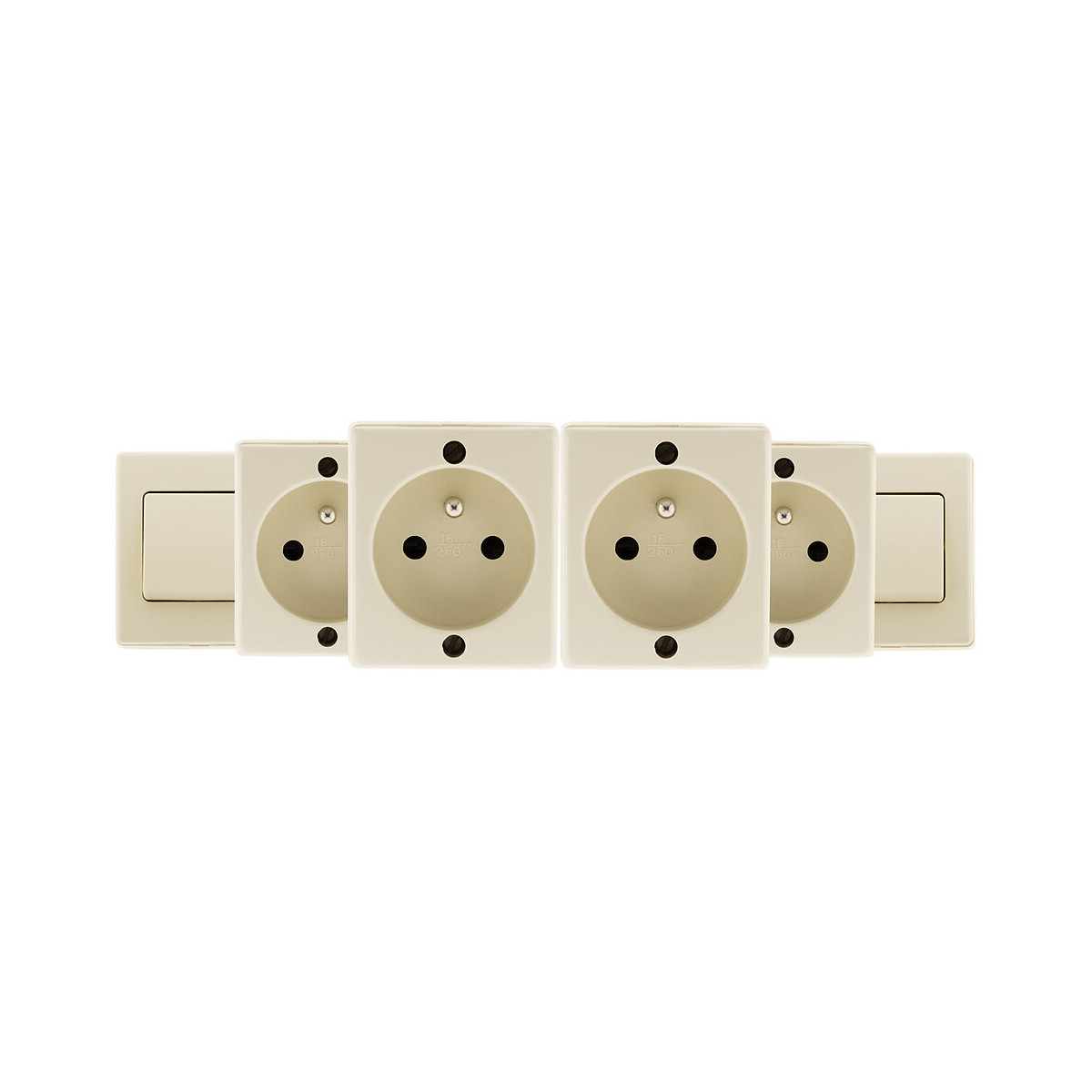 Lot de 4 prises 2P+T 16A de puissance 3680W sous 230V + 2 va-et-vient 10A de puissance 2300W sous 230V. Couleur: blanc. Mécanisme sans vis apparente, prêt à poser. Certifié CE avec sécurité enfant. Kit idéal pour couvrir les besoins de rénovation d'une installation électrique.