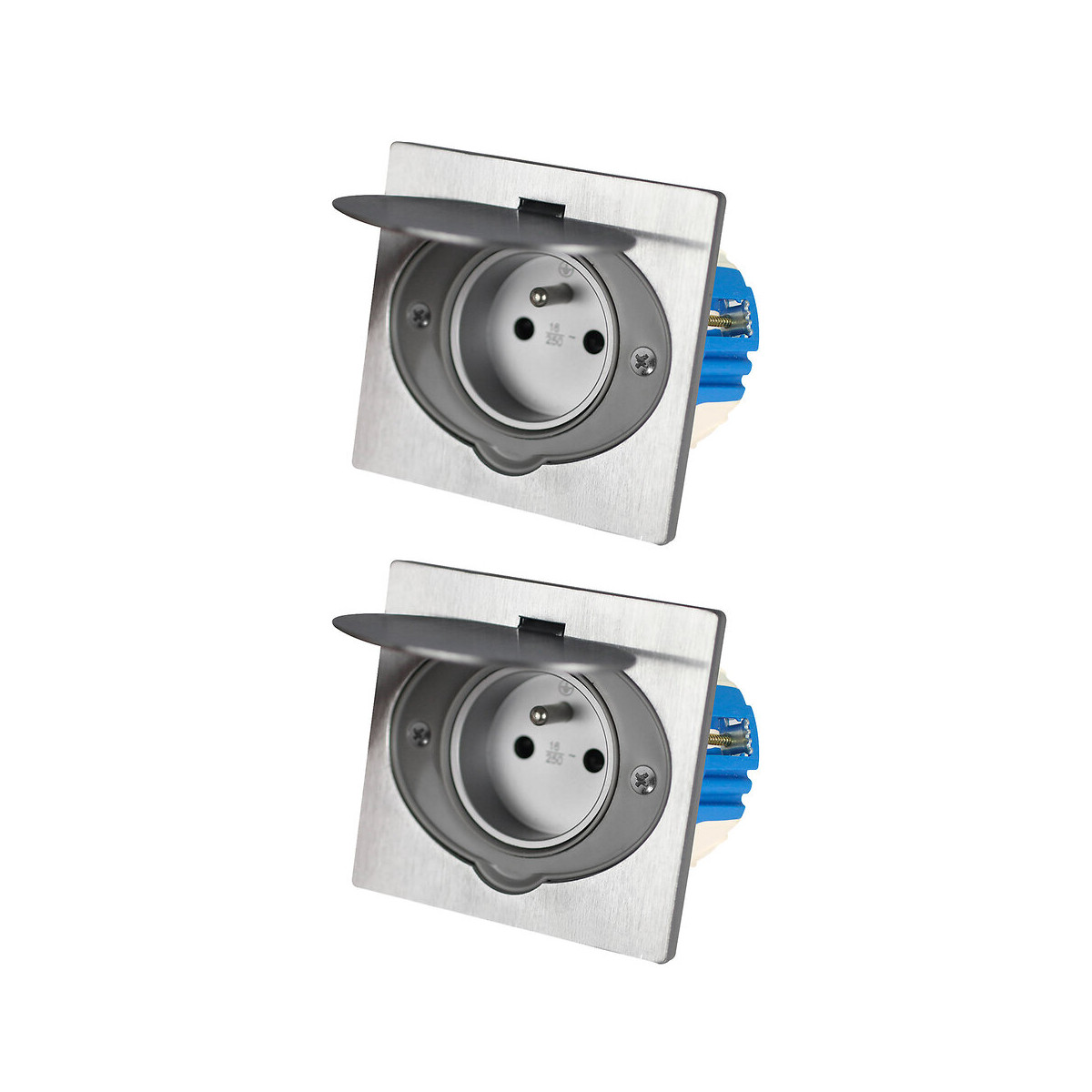 Prise de sol 2P+T 16A à bornes automatiques IP44. Idéale pour vos sols, murs et plans de travail sur votre terrasse, cuisine, bureau, séjour, garage ou bien dans votre atelier. Finition aluminium brossé avec clapet de protection (ouverture 90°). Puissance max : 3680W sous 230V. Fixation à vis en boîte d'encastrement (vis et boîte inclus). Taille du couvercle : 86x80mm. Join d'étanchéité. Livré avec une boîte d'encastrement multimatériaux no-air Ø67mm - profondeur 50mm. Schéma de montage sous la boîte.