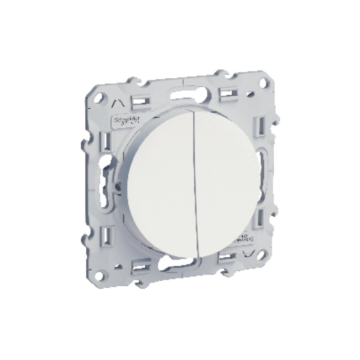 Odace, double va-et-vient Blanc, connexion rapide, à vis Mécanisme double interrupteur marche/arrêt Pose encastré Mode de fixation : Par vis 10 ampères, puissance maxi 2300 W en 230 V~