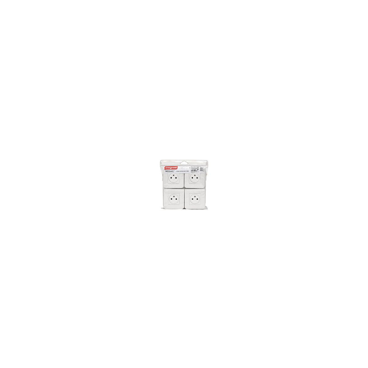 Lot de 4 prises de courant Surface Mosaic blanc complet avec plaque. Le lot de 4 prises Mosaic™Surface permet de réaliser une installation d'1 à 4 circuits de distribution électrique. Solution complète avec Supports Batibox et plaques de finitions. Le bornes de connexion dédoublées et repérées permettent le repiquage et facilitent la lisibilité du câblage.