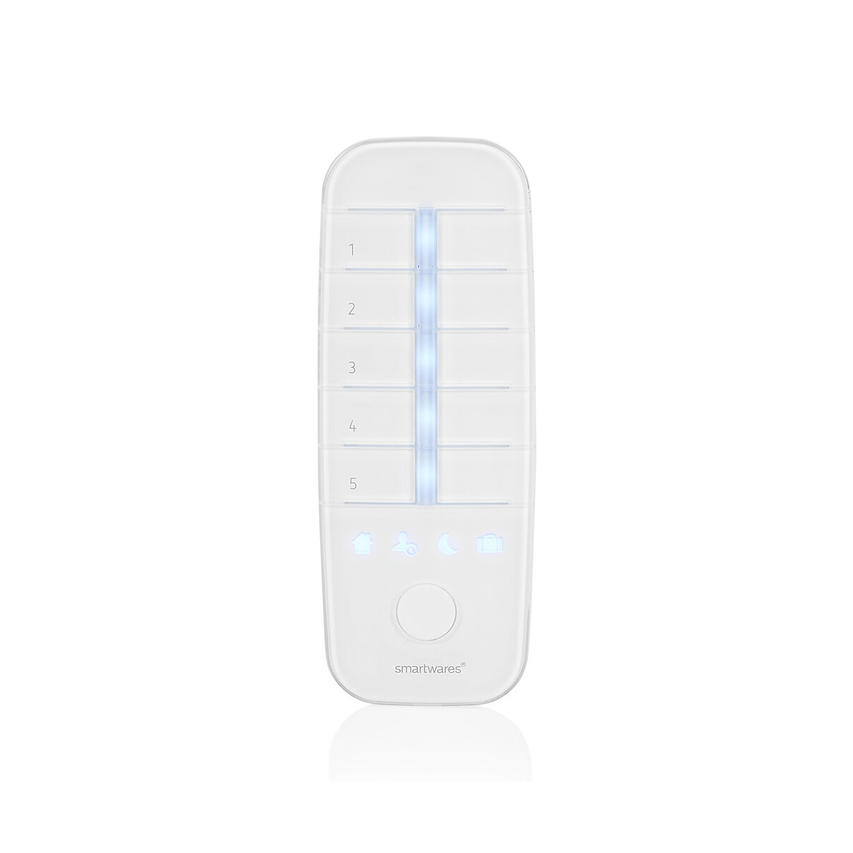 Avec cette télécommande, contrôlez vos ampoules et prises commandées de la Gamme PRO Smartwares de façon intelligente et même sans la box LINK et sans smartphone. La télécommande peut être également utilisée pour activer et arrêter l'alarme du Kit Sécurité Gamme PRO Smartwares. De nombreuses fonctionnalités : Modifiez l'intensité de vos ampoules PRO, choisissez parmi 16millions de couleurs différentes ou variez du blanc froid au blanc chaud pour plus de confort. Il est également possible d'activer ou de désactiver les périphériques connectés aux prises commandées. Le bouton rond au milieu vous permet d'activer et de désactiver tous les appareils connectés et les groupes. Installation facile : Les produits de la PRO séries peuvent être facilement appairés à la télécommande. En appuyant simultanément sur le bouton on/off une LED s'allume. Éteignez et allumez l'ampoule ou un appareil de la Gamme Pro Séries. Vous pouvez désormais utiliser les boutons de la télécommande pour tout contrôler. Pour faire un groupe, vous devez répéter ces étapes et ajouter des produits supplémentaires. Au total, il est possible de créer 5 groupes avec 12 produits chacun.