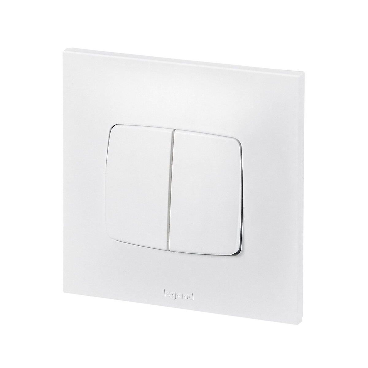 Interrupteur double poussoir Neptune de la marque Legrand. Couleur : Blanc. Intensité : 6 ampères. Puissance maxi : 2 300 watts en 230 volts. Raccordement par borne automatique après simple dénudage des fils. Fixation : vis/griffes.