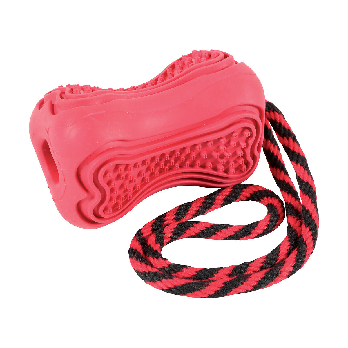 Jouet ultra-résistant fabriqué à partir de caoutchouc naturel. Sa forme spécifique permet de l'utiliser comme distributeur de friandises pour des heures de divertissement. Les rainures et les picots également présents sur le jouet favorisent l’hygiène dentaire. La corde présente sur le jouet permet de l'attraper facilement et d'interagir avec votre chien en le laissant tirer. Idéal pour les jeux de lancer et rapporter. Taille : medium. Coloris : rouge.Spécifications techniques